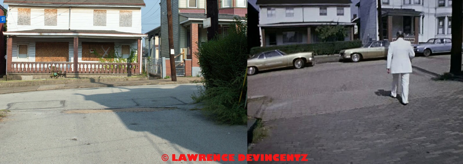 Two ladies walk by the Giant Eagle before they get harassed by a couple of guys. Directly in front of them in the movie is the former Braddock Hospital which has since been demolished to make way for apartments of some sort as you can see in the present day shot.